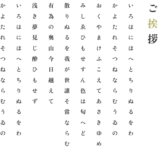 いろはにほへとちりぬるをわかよたれそつねならむうゐのおくやまけふこえてあさきゆめみしゑひもせすん色は匂へど散りぬるを我が世誰そ常ならむ有為の奥山今日越えて浅き夢見じ酔ひもせずいろはにほへとちりぬるをわかよたれそつねならむうゐのおくやまけふこえてあさきゆめみしゑひもせすん色は匂へど散りぬるを我が世誰そ常ならむ有為の奥山今日越えて浅き夢見じ酔ひもせず